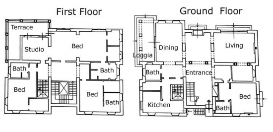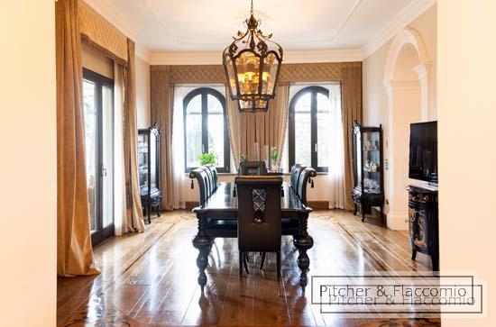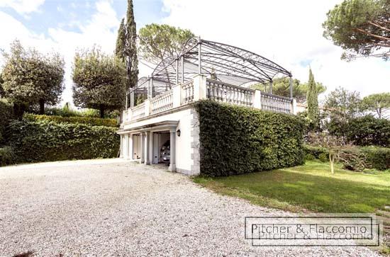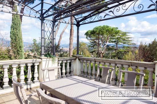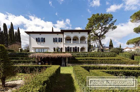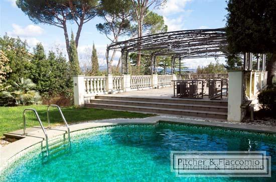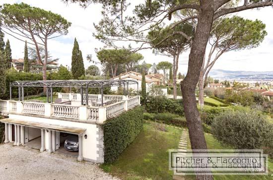 This free standing liberty villa has been totally refurbished and it is laid on two main levels for a total of approx. 850 Sq Mt (8500 Sq. Ft.) plus approx. 60 sq. mt (600 sq mt.) of dependance and surrounded by approx. 6000 sq. mt (2 acres) of private garden. the ground floor has a main entrance (plus a second staff entrance directly in the kitchen) with a living and dining area that both open on a spacious covered loggia and terrace overlooking the garden; we have a guest bathroom, a good size kitchen and pantry room and a double bedroom with en suite bathroom. Going up 24 steps of an elegant stair case we have two double bedrooms each with en suite bathroom and walk in closet and the master area made of a double bedroom, bathroom, studio two walk in closets and a spacious private terrace. The villa has also an under roof level where we have a open space room and bar that opens on a roof top terrace, and a wellness area with a spa and gym area. In the basement of the building we have the laundry area and the staff quarters. the dependance has been converted into a covered garage parking and above a great terrace and BBQ area with views over Florence. The villa has high decorated ceilings, parquet floors, autonomous heating system and air conditioning. The garden is Italian style and a salt water pool. The villa has a total of 4 bedrooms (plus one for the staff) and seven bathrooms.